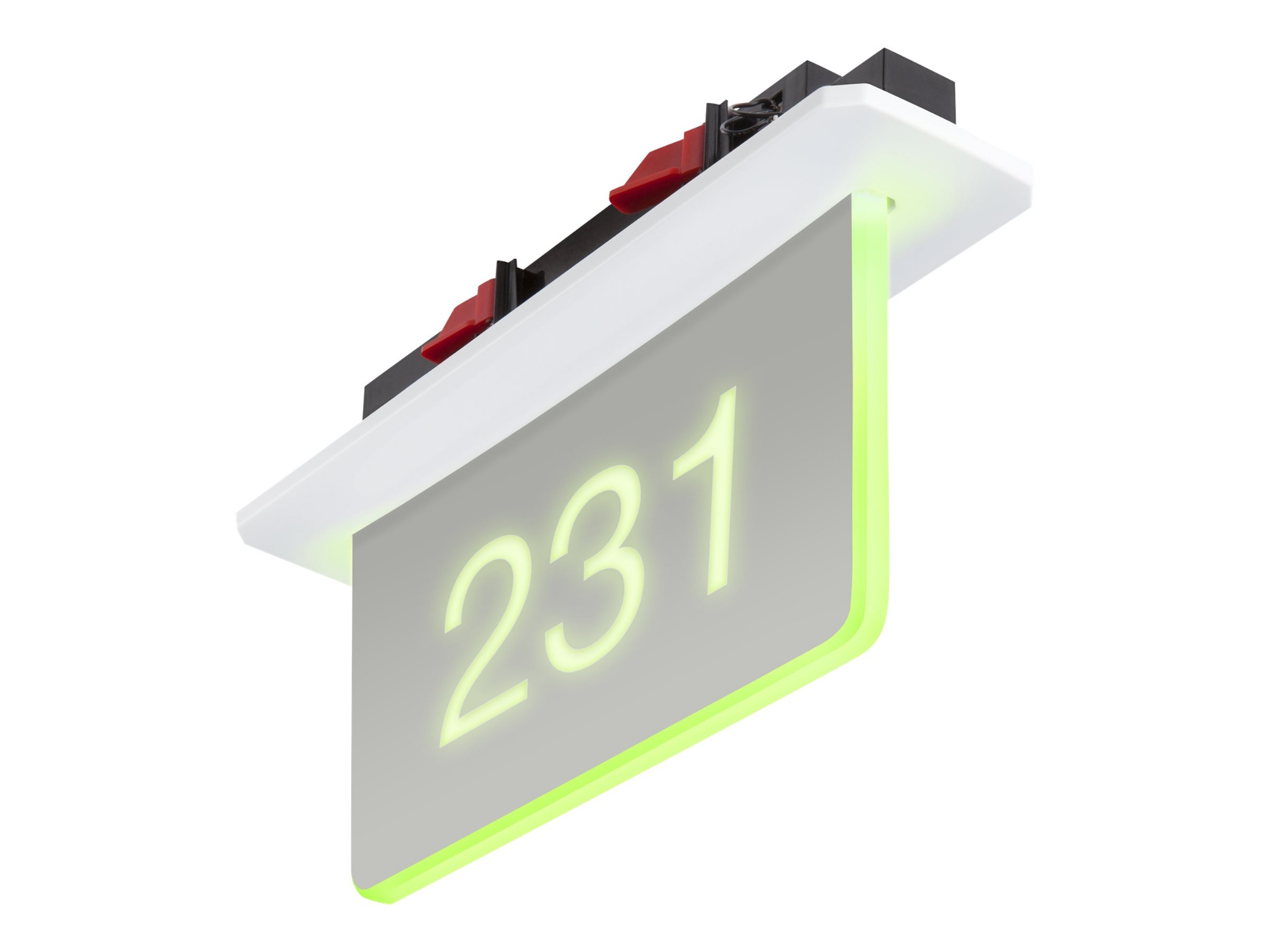 The SSC-100-EL hallway sign provides a clear indication of a room's availability with enhanced contrast and visibility as part of a complete Crestron enterprise room scheduling solution. The SSC-100-EL features a stylish appearance and vivid color illumination that complements any corporate office environment. The two-sided, gray acrylic sign face illuminates bright green or red to indicate the room availability status. The sign face is custom engravable with the room number, name, icon, or other designation. The complete sign assembly mounts into a cutout in a drywall or drop-tile ceiling. TAA Compliant.